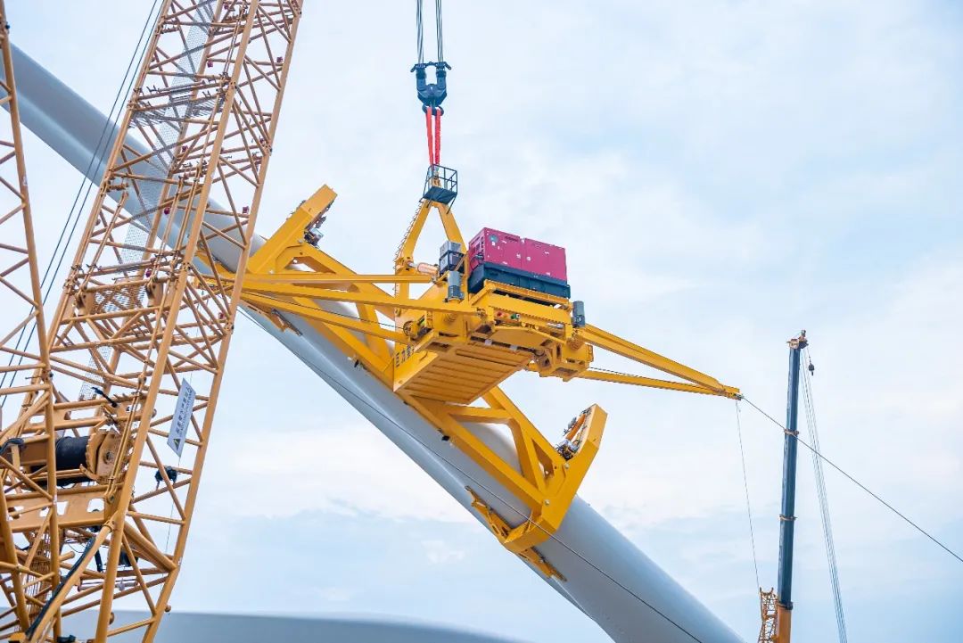 大兆瓦全角度海上單葉片吊具可滿足單只葉片最大承重50噸。同時(shí),將原有的吊裝窗口平均風(fēng)速提升至15m/s,最大陣風(fēng)風(fēng)速可達(dá)18m/s,極大拓寬了風(fēng)機(jī)吊裝窗口期,突破了海上吊裝作業(yè)風(fēng)速邊界限制,是又一款海上風(fēng)電單葉片吊裝“利器”。