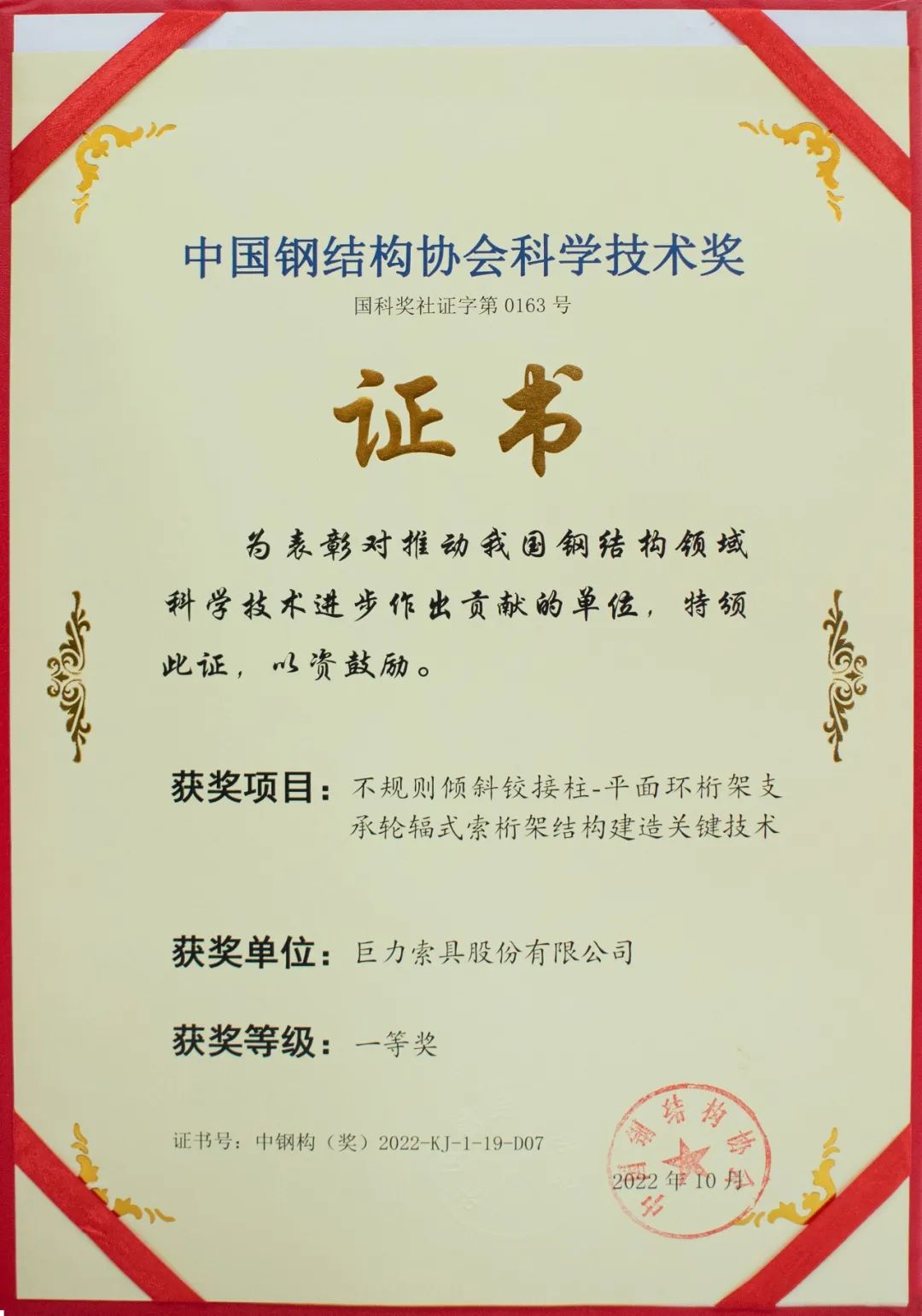 巨力索具斬獲“中國(guó)鋼結(jié)構(gòu)協(xié)會(huì)科學(xué)技術(shù)獎(jiǎng)”一等獎(jiǎng)!